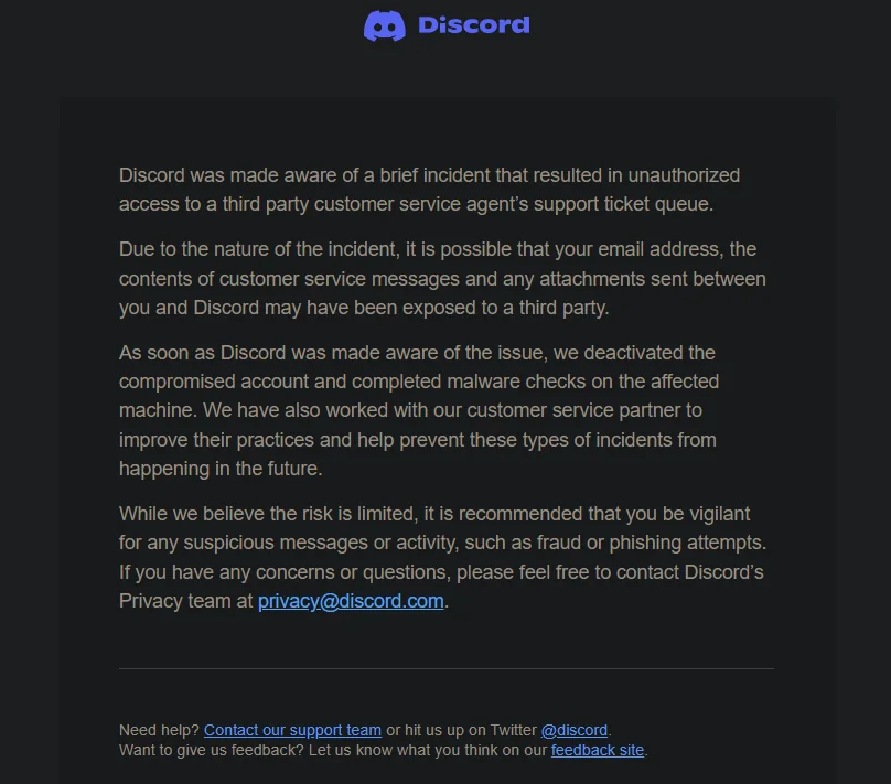 "Due to the nature of the incident, it is possible that your email address, the contents of customer service messages and any attachments sent between you and Discord may have been exposed to a third party," Discord said in letters sent to affected users.