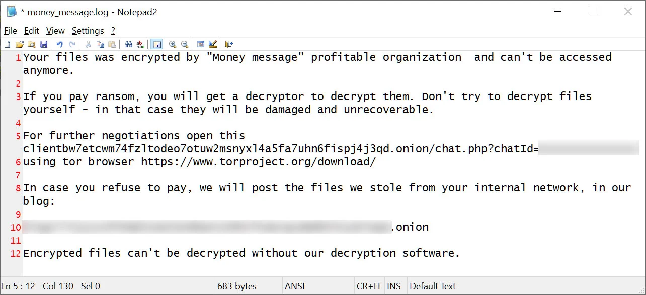 After encrypting the device, the ransomware will create a ransom note named money_message.log that contains a link to a TOR negotiation site used to negotiate with the threat actors.