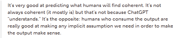 ChatGPT will answer this riddle correctly, and you might assume it does so because it is a coldly logical computer that doesn't have any "common sense" to trip it up. But that's not what's going on under the hood. ChatGPT isn't logically reasoning out the answer; it's just generating output based on its predictions of what should follow a question about a pound of feathers and a pound of lead. Since its training set includes a bunch of text explaining the riddle, it assembles a version of that correct answer. But if you ask ChatGPT whether two pounds of feathers are heavier than a pound of lead, it will confidently tell you they weigh the same amount, because that's still the most likely output to a prompt about feathers and lead, based on its training set. It can be fun to tell the AI that it's wrong and watch it flounder in response; I got it to apologize to me for its mistake and then suggest that two pounds of feathers weigh four times as much as a pound of lead.