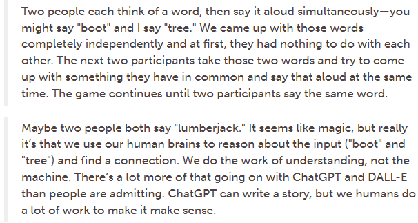The mathematics and coding that go into creating and training generative AI models are quite complex, and well beyond the scope of this article. But if you interact with the models that are the end result of this process, the experience can be decidedly uncanny. You can get DALL-E to produce things that look like real works of art. You can have conversations with ChatGPT that feel like a conversation with another human. Have researchers truly created a thinking machine?