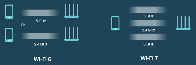 Instead of connecting to a single 2.4GHz, 5GHz or 6GHz channel, as with Wi-Fi 6E, Wi-Fi 7 would allow a client to use all three bands simultaneously. This lowers latency, significantly increases the data rate, improves load balancing across bands, and offers increased network reliability by duplicating packets across multiple links.