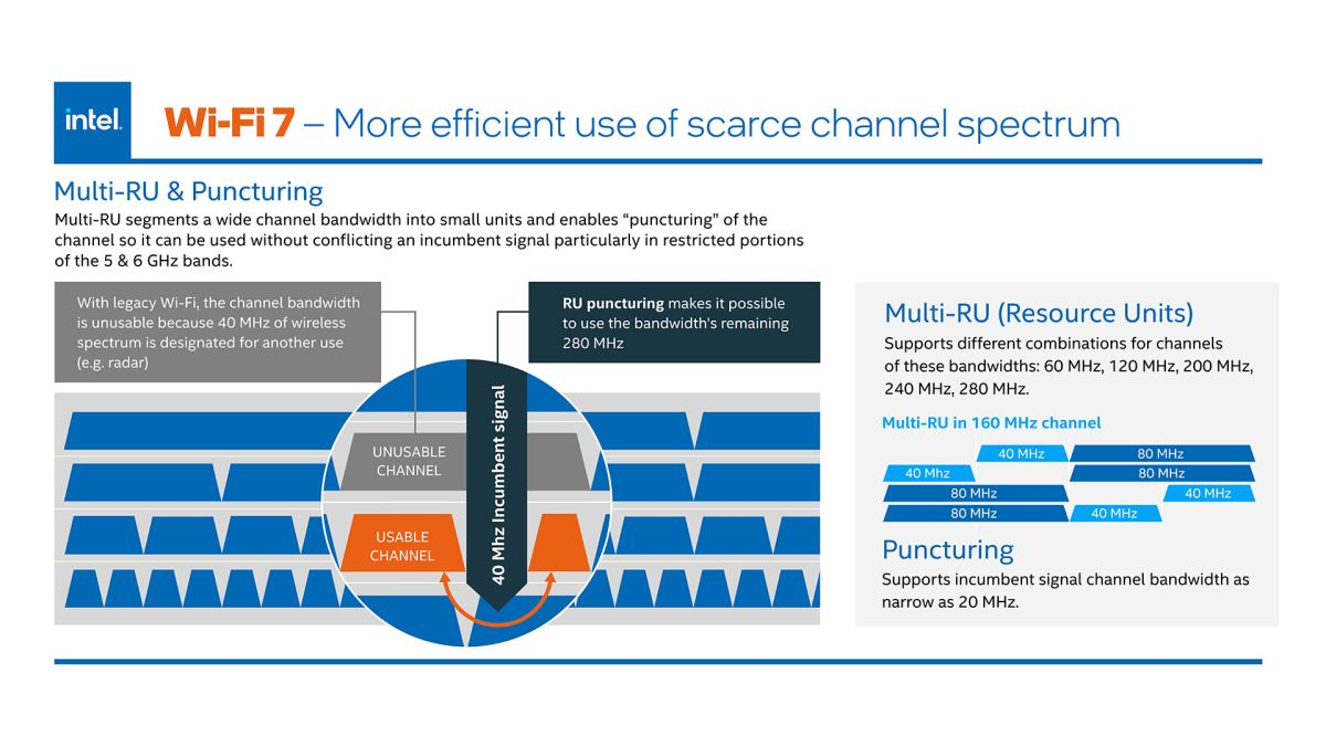 In addition, Wi-Fi 7 supports preamble puncturing, which enables a client to use spectrum that another user otherwise occupied. In the example above provided by Intel, 40MHz of wireless spectrum is in use (out of a 320MHz total channel bandwidth). Puncturing allows the unused 280MHz of bandwidth to be allocated for a client.